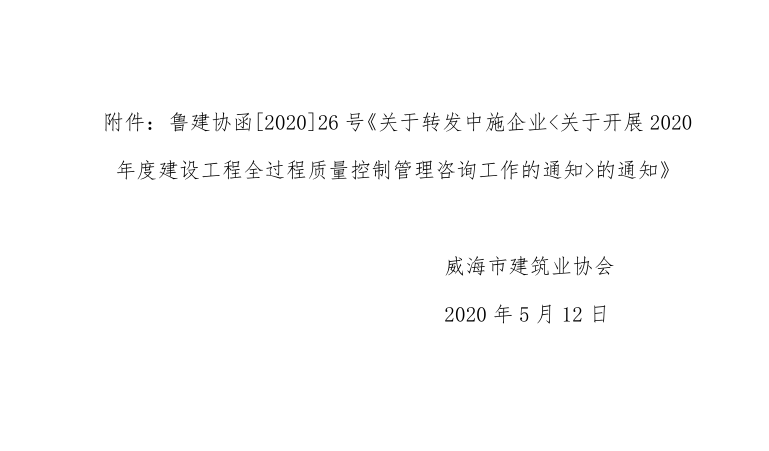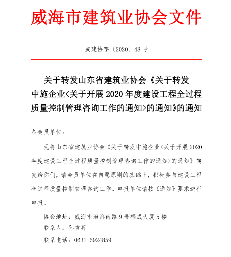 關(guān)于轉(zhuǎn)發(fā)山東省建筑業(yè)協(xié)會《關(guān)于轉(zhuǎn)發(fā) 中施企業(yè)<關(guān)于開展2020年度建設(shè)工程全過程質(zhì)量控制管理咨詢工作的通知>的通知》的通知