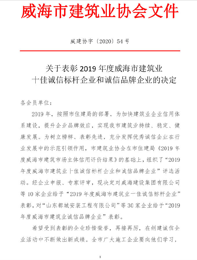 >關(guān)于表彰2019年度威海市建筑業(yè)十佳誠(chéng)信標(biāo)桿企業(yè)和誠(chéng)信品牌企業(yè)的決定