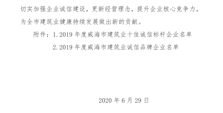 關(guān)于表彰2019年度威海市建筑業(yè)十佳誠(chéng)信標(biāo)桿企業(yè)和誠(chéng)信品牌企業(yè)的決定