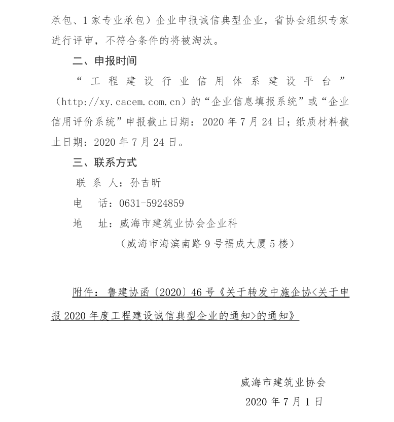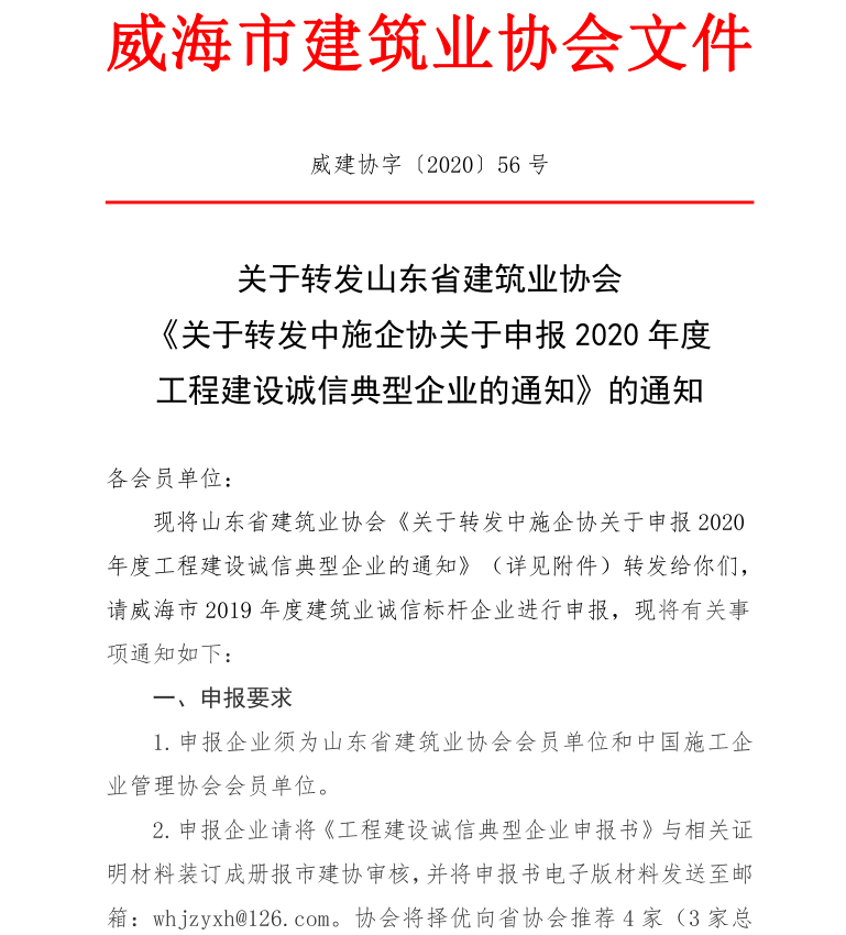 關(guān)于轉(zhuǎn)發(fā)山東省建筑業(yè)協(xié)會 《關(guān)于轉(zhuǎn)發(fā)中施企協(xié)關(guān)于申報2020年度 工程建設(shè)誠信典型企業(yè)的通知》的通知