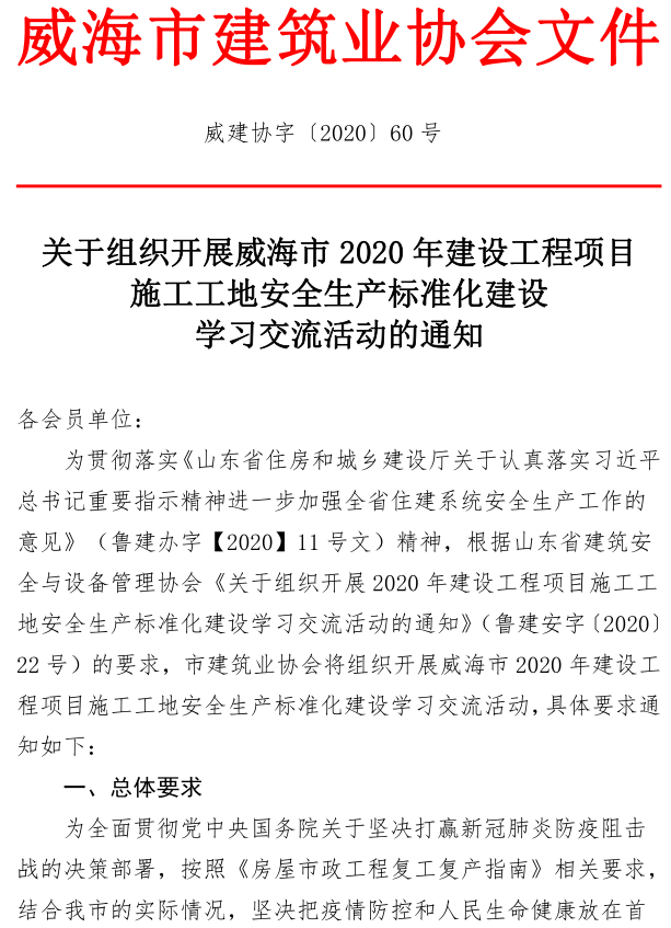 關于組織開展威海市2020年建設工程項目施工工地安全生產(chǎn)標準化建設學習交流活動的通知