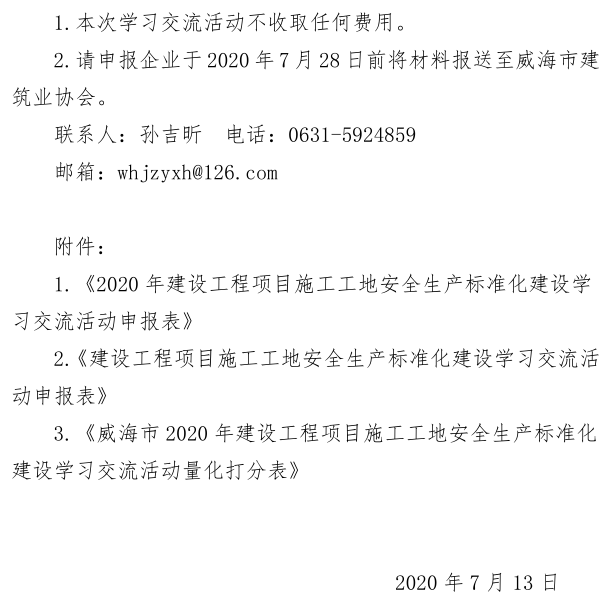 >關于組織開展威海市2020年建設工程項目施工工地安全生產(chǎn)標準化建設學習交流活動的通知