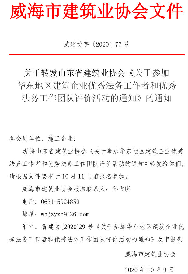 關(guān)于轉(zhuǎn)發(fā)山東省建筑業(yè)協(xié)會(huì)《關(guān)于參加 華東地區(qū)建筑企業(yè)優(yōu)秀法務(wù)工作者和優(yōu)秀 法務(wù)工作團(tuán)隊(duì)評(píng)價(jià)活動(dòng)的通知》的通知