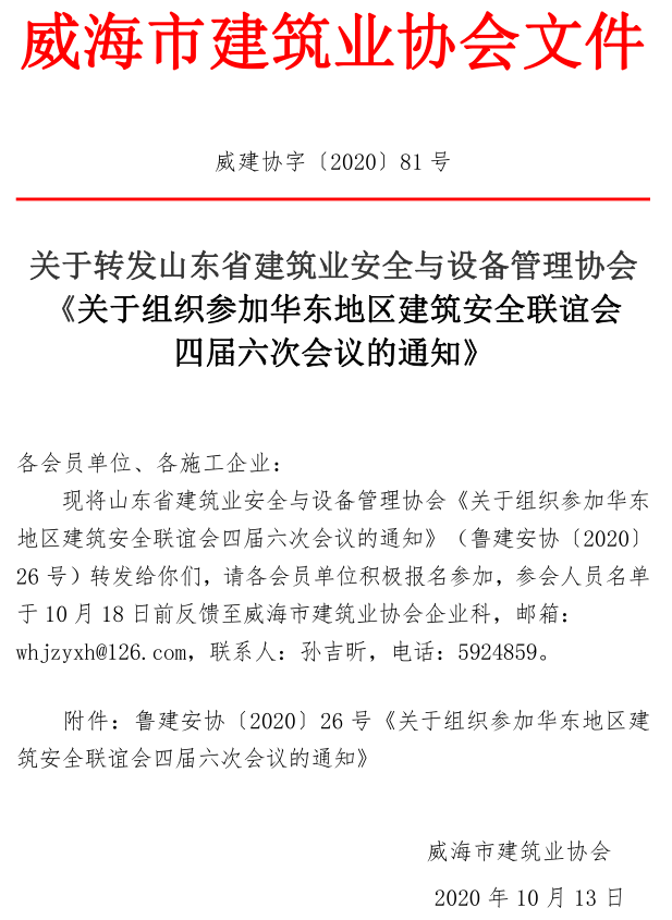 - 當(dāng)前位置:首頁 >文件公告>關(guān)于轉(zhuǎn)發(fā)山東省建筑業(yè)安全與設(shè)備管理協(xié)會(huì)《關(guān)于組織參加華東地區(qū)建筑安全聯(lián)誼會(huì)四屆六次會(huì)議的通知》