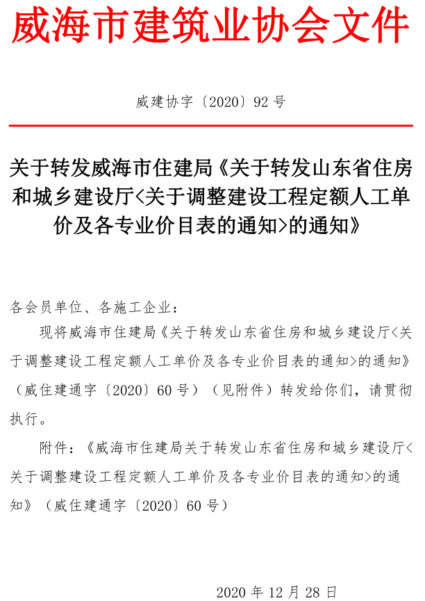 關(guān)于轉(zhuǎn)發(fā)威海市住建局《關(guān)于轉(zhuǎn)發(fā)山東省住房和城鄉(xiāng)建設(shè)廳<關(guān)于調(diào)整建設(shè)工程定額人工單價(jià)及各專業(yè)價(jià)目表的通知>的通知》