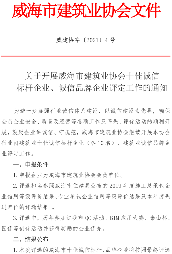 關(guān)于開(kāi)展威海市建筑業(yè)協(xié)會(huì)十佳誠(chéng)信 標(biāo)桿企業(yè)、誠(chéng)信品牌企業(yè)評(píng)定工作的通知