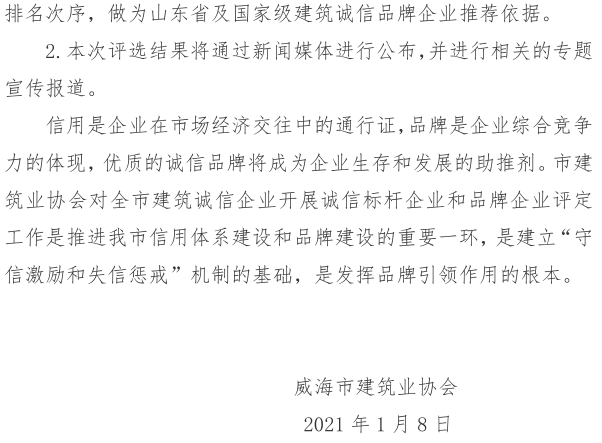 >關(guān)于開(kāi)展威海市建筑業(yè)協(xié)會(huì)十佳誠(chéng)信 標(biāo)桿企業(yè)、誠(chéng)信品牌企業(yè)評(píng)定工作的通知