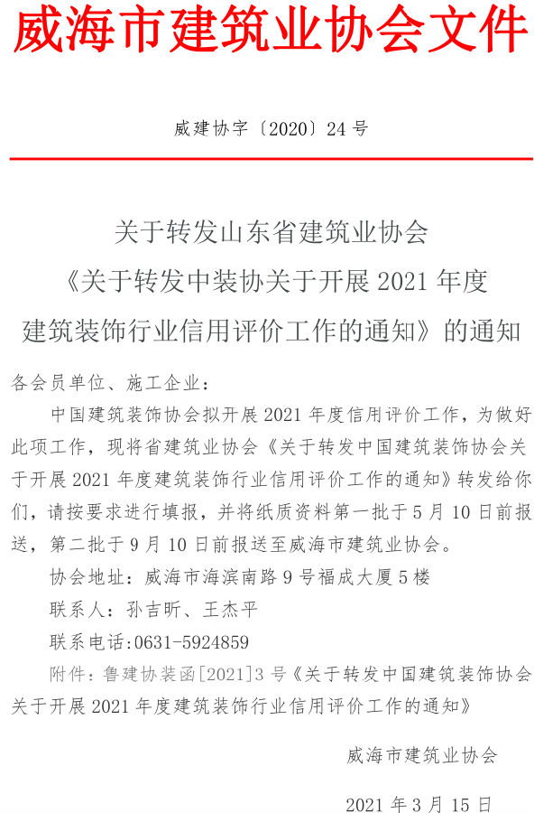 關(guān)于轉(zhuǎn)發(fā)山東省建筑業(yè)協(xié)會(huì) 《關(guān)于轉(zhuǎn)發(fā)中裝協(xié)關(guān)于開展2021年度 建筑裝飾行業(yè)信用評(píng)價(jià)工作的通知》的通知