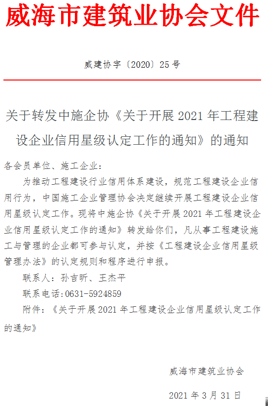 關(guān)于轉(zhuǎn)發(fā)中施企協(xié)《關(guān)于開展2021年工程建 設(shè)企業(yè)信用星級認(rèn)定工作的通知》的通知