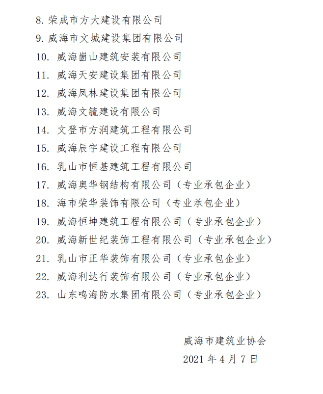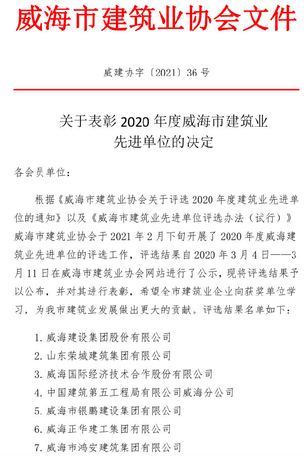 關于表彰2020年度威海市建筑業(yè)先進單位的決定