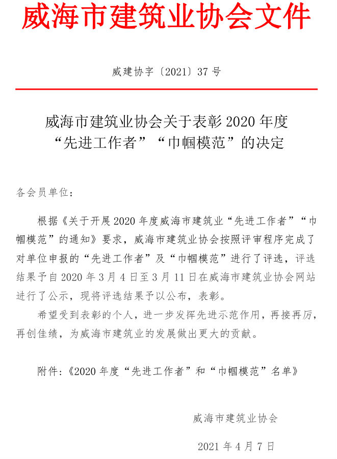 >威海市建筑業(yè)協(xié)會關(guān)于表彰2020年度 “先進(jìn)工作者”“巾幗模范”的決定