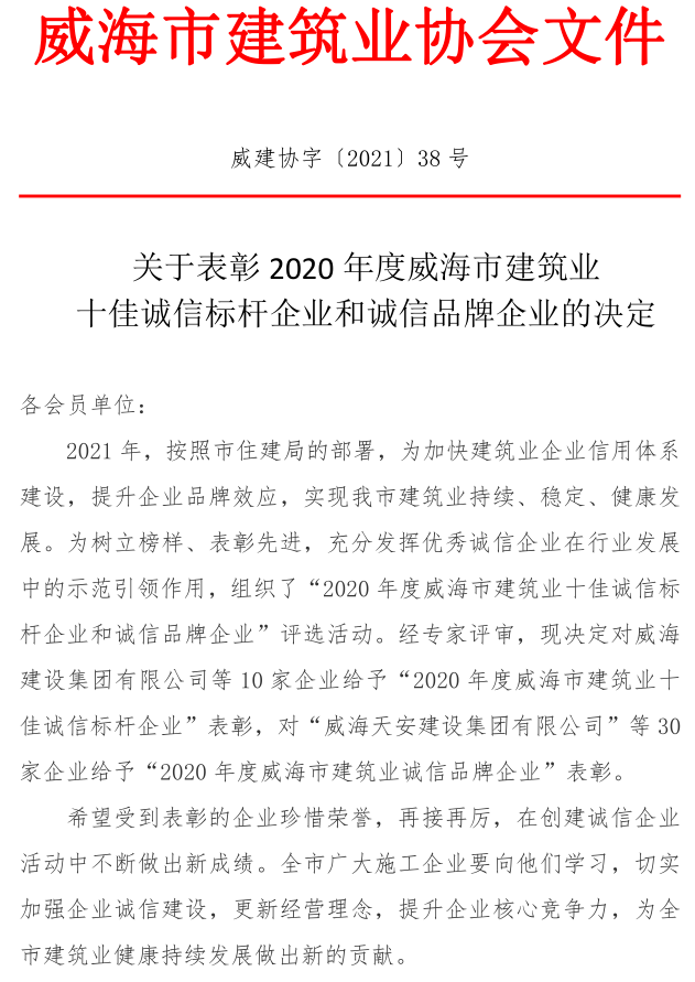 >關(guān)于表彰2020年度威海市建筑業(yè) 十佳誠信標(biāo)桿企業(yè)和誠信品牌企業(yè)的決定