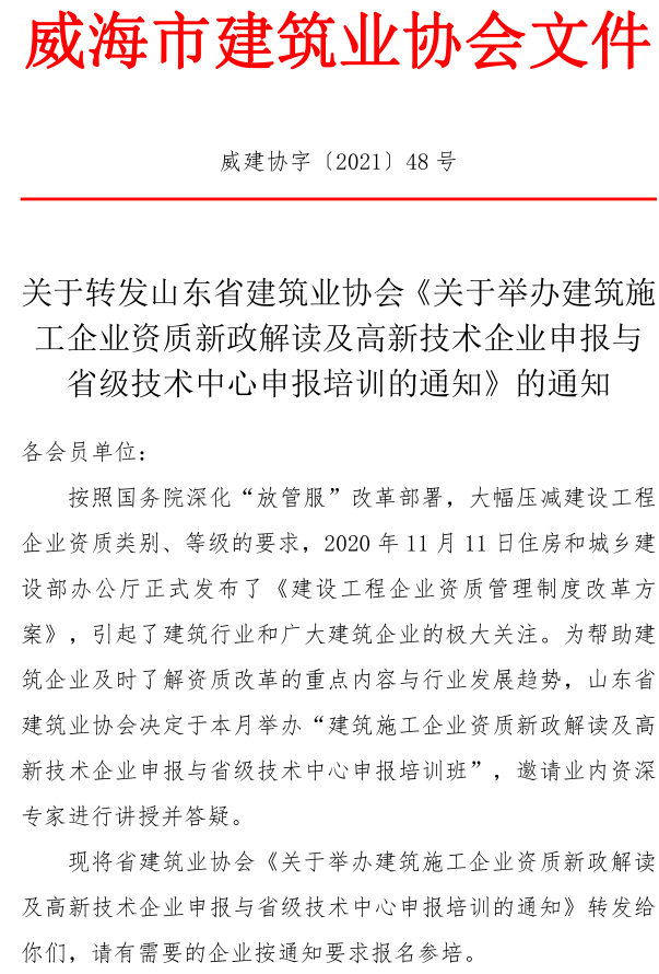 關(guān)于轉(zhuǎn)發(fā)山東省建筑業(yè)協(xié)會(huì)《關(guān)于舉辦建筑施工企業(yè)資質(zhì)新政解讀及高新技術(shù)企業(yè)申報(bào)與省級(jí)技術(shù)中心申報(bào)培訓(xùn)的通知》的通知