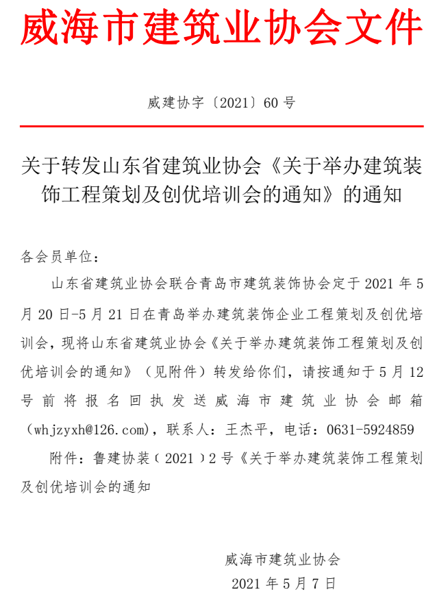 關(guān)于轉(zhuǎn)發(fā)山東省建筑業(yè)協(xié)會(huì)《關(guān)于舉辦建筑裝飾工程策劃及創(chuàng)優(yōu)培訓(xùn)會(huì)的通知》的通知