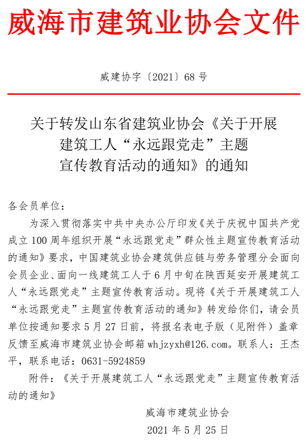 >關于轉發(fā)山東省建筑業(yè)協(xié)會《關于開展 建筑工人“永遠跟黨走”主題 宣傳教育活動的通知》的通知