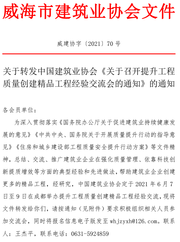 關(guān)于轉(zhuǎn)發(fā)中國建筑業(yè)協(xié)會《關(guān)于召開提升工程質(zhì)量創(chuàng)建精品工程經(jīng)驗交流會的通知》的通知