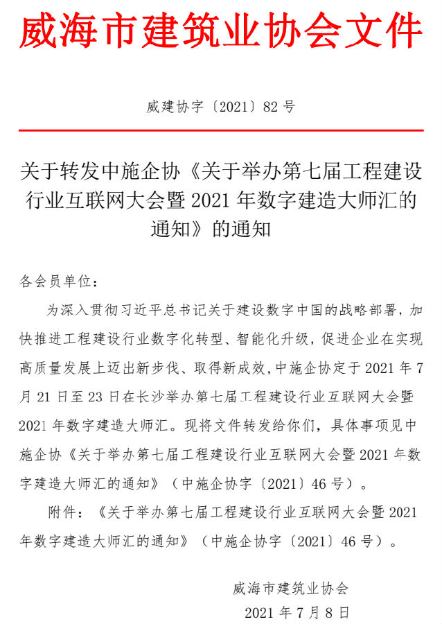 關(guān)于轉(zhuǎn)發(fā)中施企協(xié)《關(guān)于舉辦第七屆工程建設(shè)行業(yè)互聯(lián)網(wǎng)大會暨2021年數(shù)字建造大師匯的通知》的通知?
