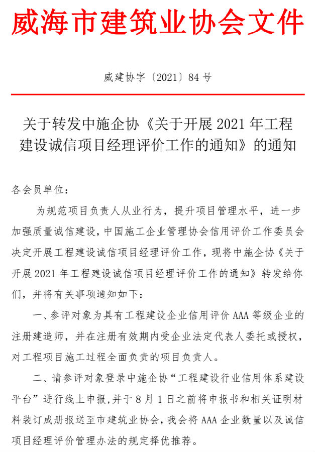 >關(guān)于轉(zhuǎn)發(fā)中施企協(xié)《關(guān)于開展2021年工程 建設(shè)誠信項(xiàng)目經(jīng)理評價工作的通知》的通知
