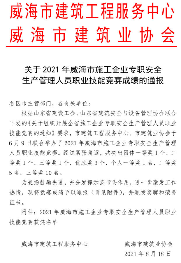 >關(guān)于2021年威海市施工企業(yè)專職安全 生產(chǎn)管理人員職業(yè)技能競賽成績的通報(bào)