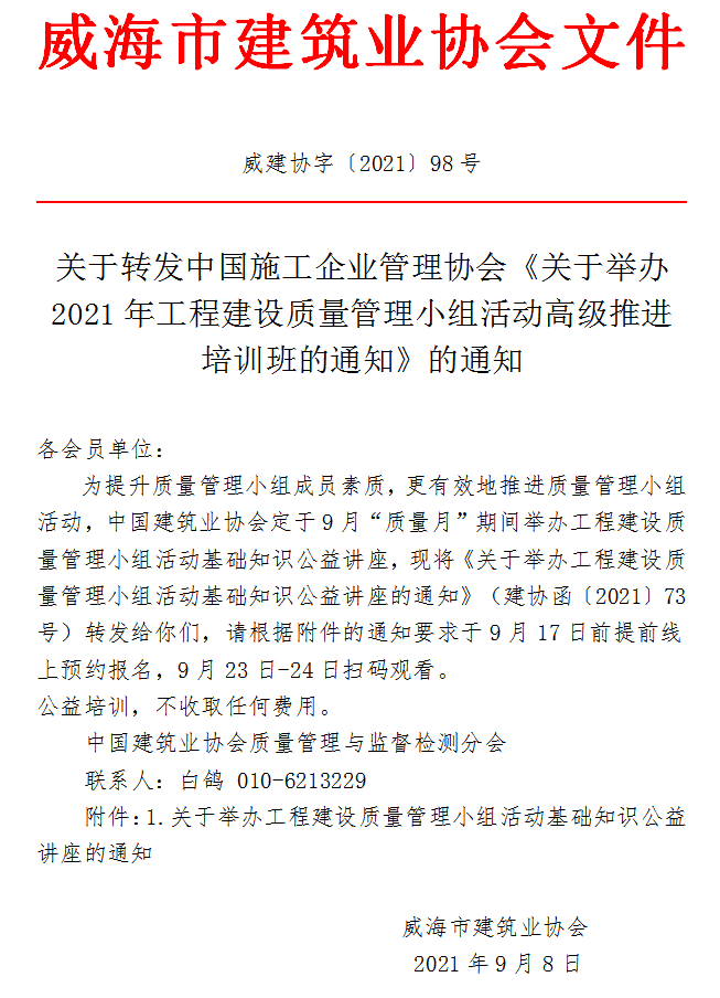 • 當(dāng)前位置:首頁 >文件公告>關(guān)于轉(zhuǎn)發(fā)中國施工企業(yè)管理協(xié)會《關(guān)于舉辦2021年工程建設(shè)質(zhì)量管理小組活動高級推進(jìn)培訓(xùn)班的通知》的通知