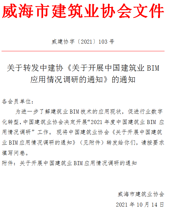關(guān)于轉(zhuǎn)發(fā)中建協(xié)《關(guān)于開展中國建筑業(yè)BIM應(yīng)用情況調(diào)研的通知》的通知