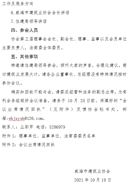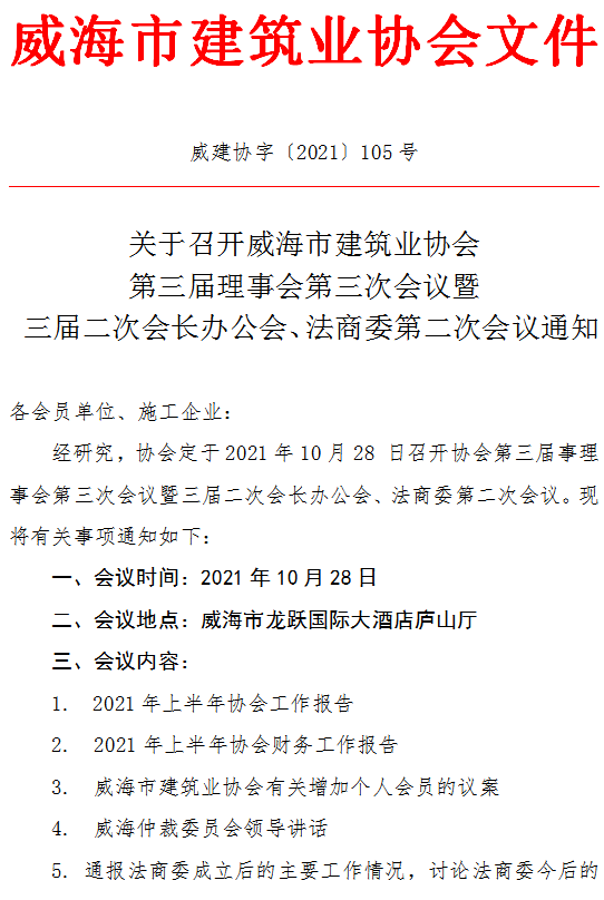 關(guān)于召開威海市建筑業(yè)協(xié)會第三屆理事會第三次會議暨?三屆二次會長辦公會、法商委第二次會議通知