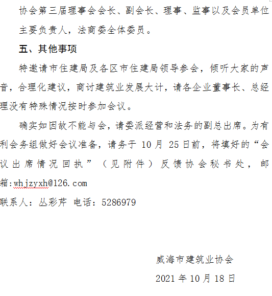 關(guān)于召開威海市建筑業(yè)協(xié)會第三屆理事會第三次會議暨?三屆二次會長辦公會、法商委第二次會議通知