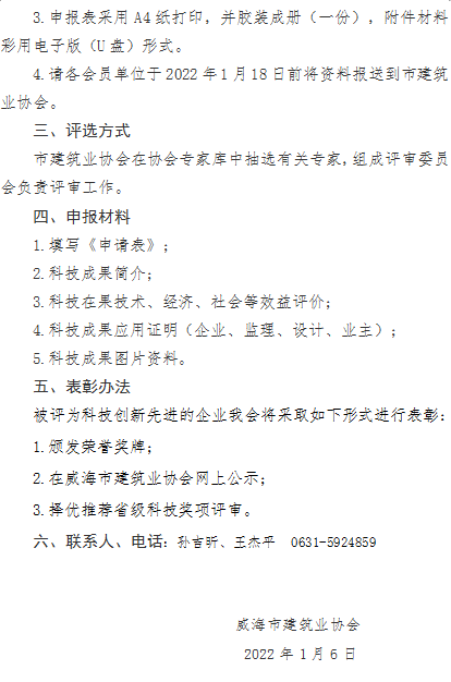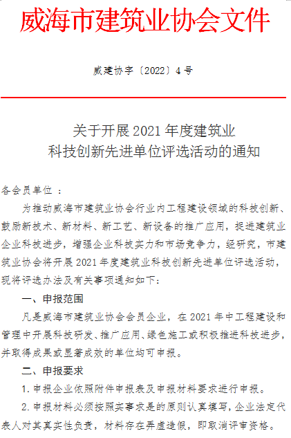 關(guān)于開展威海市2021年度威海市建筑業(yè)科技創(chuàng)新先進(jìn)單位評(píng)選活動(dòng)的通知