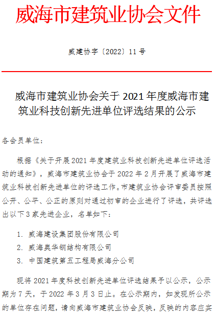 >威海市建筑業(yè)協(xié)會關(guān)于2021年度威海市建筑業(yè)科技創(chuàng)新先進(jìn)單位評選結(jié)果的公示