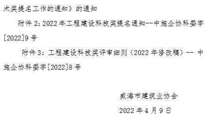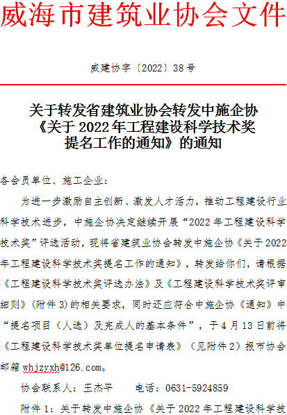 關(guān)于轉(zhuǎn)發(fā)省建筑業(yè)協(xié)會(huì)轉(zhuǎn)發(fā)中施企協(xié)《關(guān)于2022年工程建設(shè)科學(xué)技術(shù)獎(jiǎng)提名工作的通知》的通知