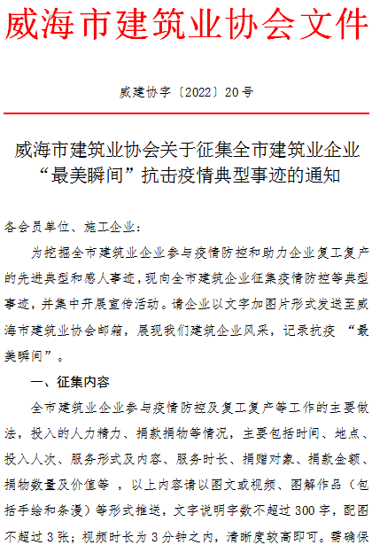 威海市建筑業(yè)協(xié)會關于征集全市建筑業(yè)企業(yè)“最美瞬間”抗擊疫情典型事跡的通知