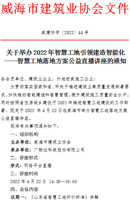 >關(guān)于舉辦2022年智慧工地引領(lǐng)建造智能化工地公益講座的通知