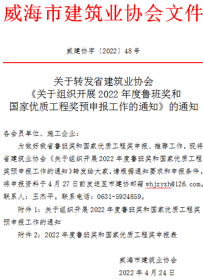 關(guān)于轉(zhuǎn)發(fā)省建筑業(yè)協(xié)會《關(guān)于組織開展2022年度魯班獎(jiǎng)和國家優(yōu)質(zhì)工程獎(jiǎng)?lì)A(yù)申報(bào)工作的通知》的通知