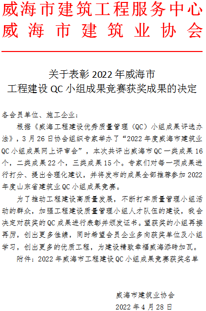 關于表彰2022年威海市工程建設QC小組成果競賽獲獎成果的決定