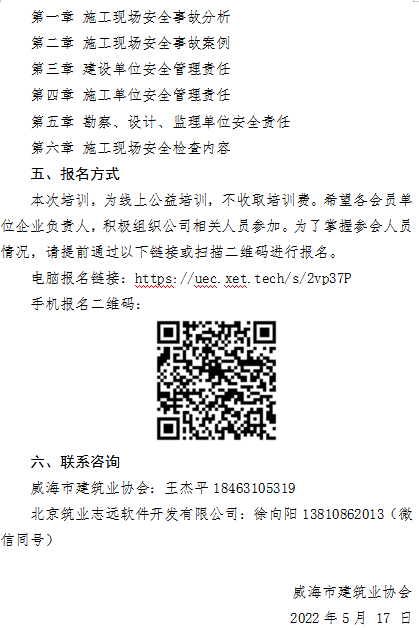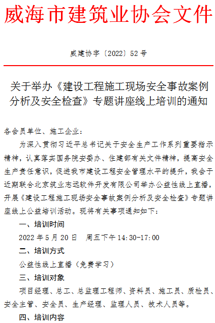 >威海市建筑業(yè)協(xié)會關于舉辦《建設工程施工現(xiàn)場安全事故案例分析及安全檢查》專題講座線上培訓的通知