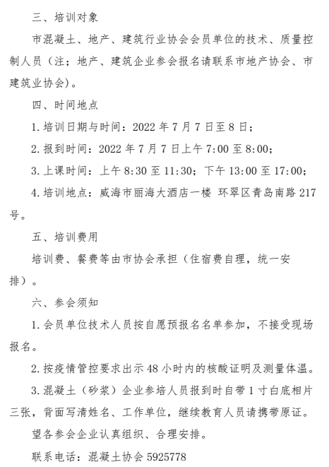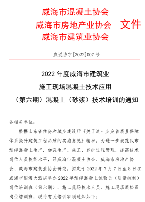2022 年度威海市建筑業(yè)施工現(xiàn)場(chǎng)混凝土技術(shù)應(yīng)用(第六期)混凝土(砂漿)技術(shù)培訓(xùn)的通知