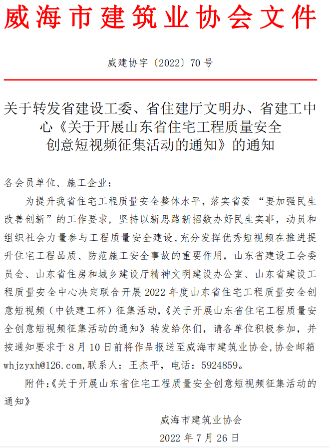 • 當(dāng)前位置:首頁(yè) >文件公告>關(guān)于轉(zhuǎn)發(fā)省建設(shè)工委、省住建廳文明辦、省建工中心《關(guān)于開(kāi)展山東省住宅工程質(zhì)量安全 創(chuàng)意短視頻征集活動(dòng)的通知》的通知