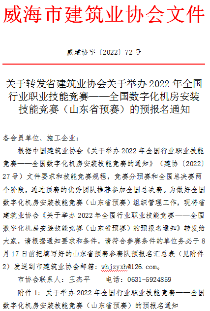 關(guān)于轉(zhuǎn)發(fā)省建筑業(yè)協(xié)會關(guān)于舉辦2022年全國行業(yè)職業(yè)技能競賽——全國數(shù)字化機房安裝技能競賽(山東省預(yù)賽)的預(yù)報名通知