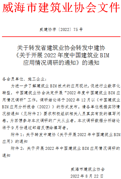 關(guān)于轉(zhuǎn)發(fā)省建筑業(yè)協(xié)會轉(zhuǎn)發(fā)中建協(xié)《關(guān)于開展2022年度中國建筑業(yè)BIM應(yīng)用情況調(diào)研的通知》的通知