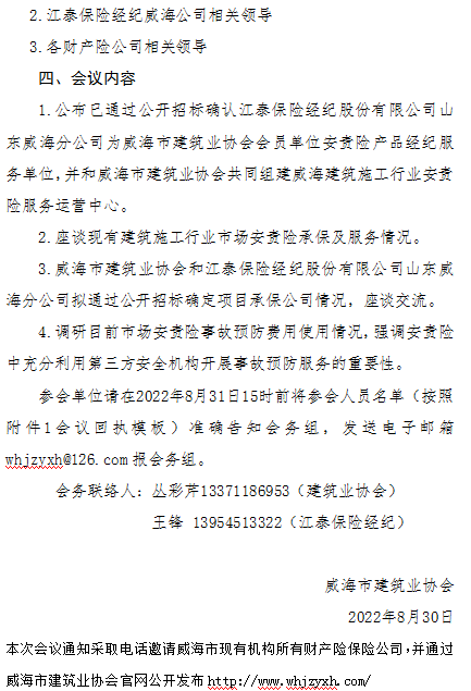 威海市建筑業(yè)協(xié)會關(guān)于召開威海市住建行業(yè)安責(zé)險座談會議的通知