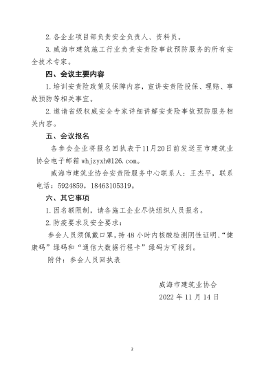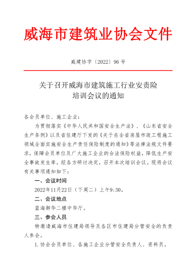 關(guān)于召開威海市建筑施工行業(yè)安責(zé)險(xiǎn) 培訓(xùn)會(huì)議的通知