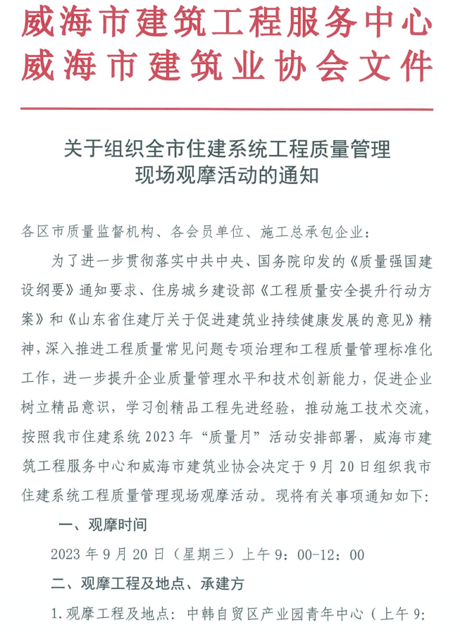 關(guān)于組織全市住建系統(tǒng)工程質(zhì)量管理現(xiàn)場觀摩活動的通知