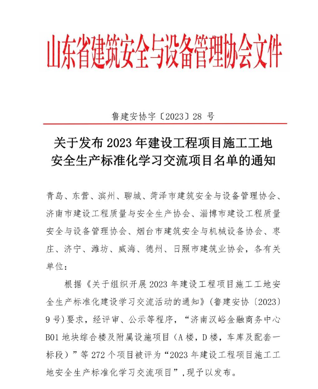 近日,山東省建筑安全與設(shè)備管理協(xié)會公布了2023年建設(shè)工程項(xiàng)目施工工地安全生產(chǎn)標(biāo)準(zhǔn)化建設(shè)學(xué)習(xí)交流項(xiàng)目名單,威海10個(gè)項(xiàng)目(具體名單見附件)上榜,為鼓勵(lì)先進(jìn),現(xiàn)對獲得以上榮譽(yù)的企業(yè)、項(xiàng)目、進(jìn)行通報(bào)表彰。