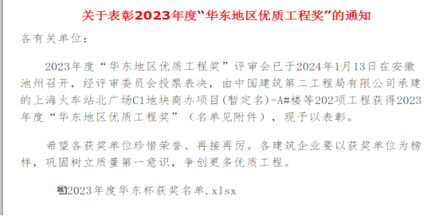 關于對榮獲2023年度 “華東地區(qū)優(yōu)質工程獎”的工程表彰的通報