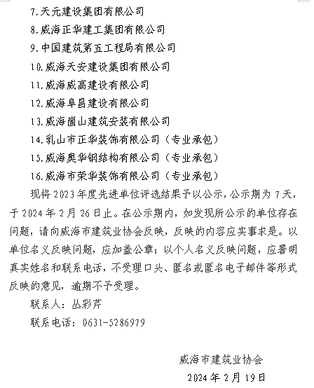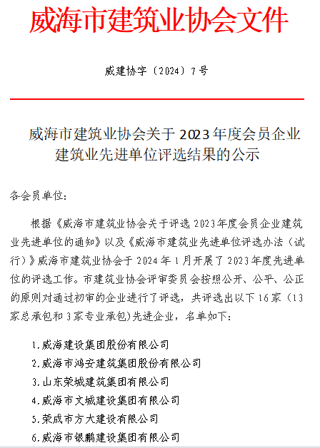 >威建協(xié)字2024年7號威海市建筑業(yè)協(xié)會關(guān)于2023年度先進(jìn)單位評選結(jié)果的公示