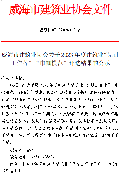 >威建協(xié)字2024年9號威海市建筑業(yè)協(xié)會關于對2023年度“先進工作者”“巾幗模范”評選結果的公示