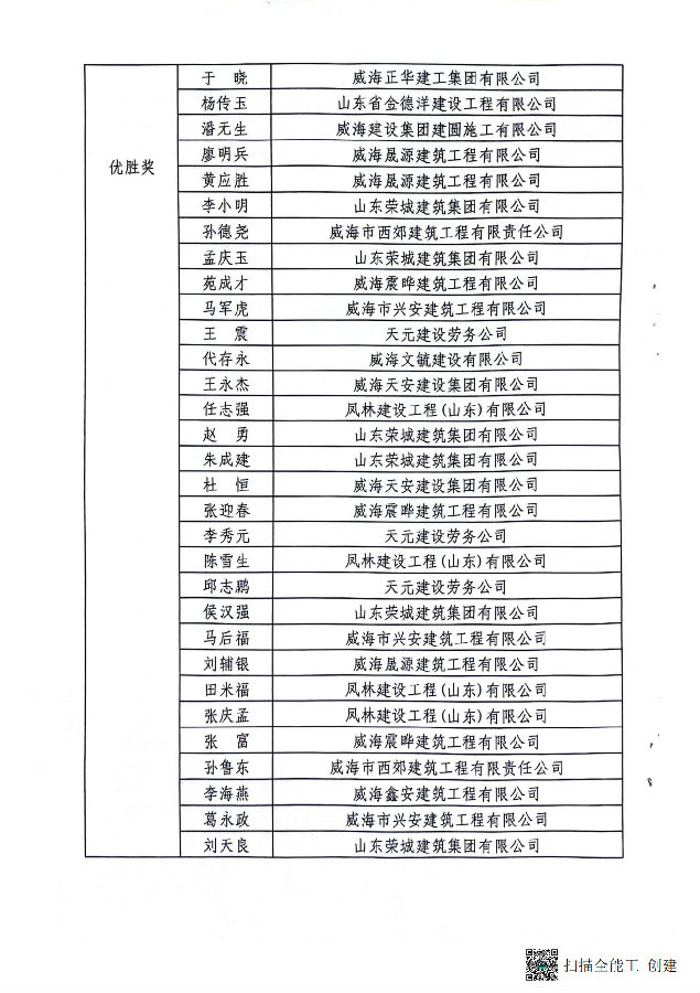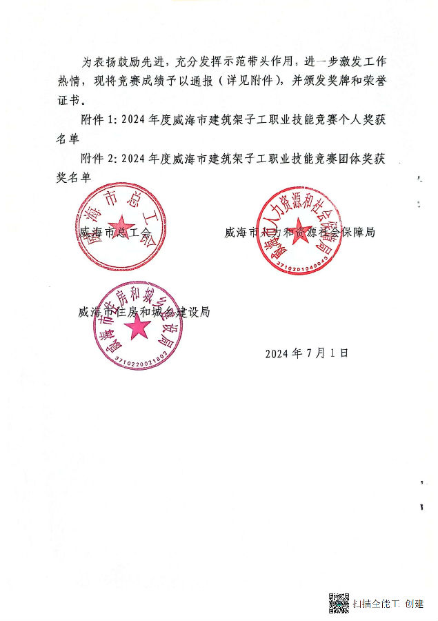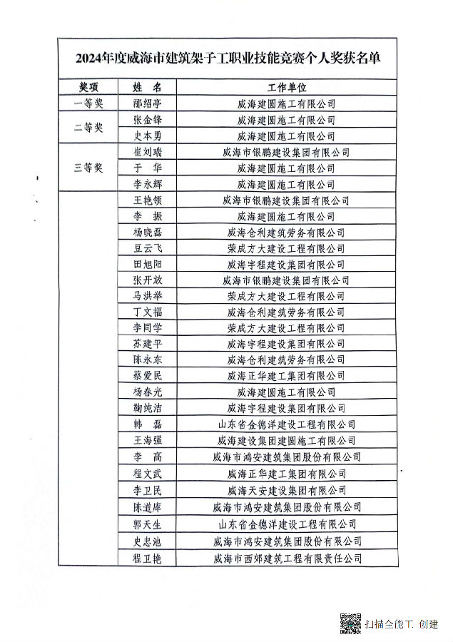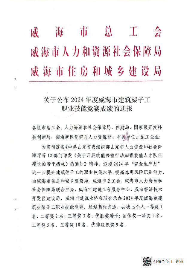 >關(guān)于公布2024年度威海市建筑架子工職業(yè)技能競(jìng)賽成績(jī)的通報(bào)