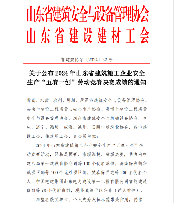 近日,山東省建筑安全與設(shè)備管理協(xié)會發(fā)布《關(guān)于公布2024年山東省建筑施工企業(yè)安全生產(chǎn)“五賽一創(chuàng)”勞動競賽決賽成績的通知》,威海市榮獲“優(yōu)勝單位”3個(gè),“優(yōu)勝項(xiàng)目部”5個(gè),“優(yōu)勝班組”5個(gè),“優(yōu)勝個(gè)人”12名。